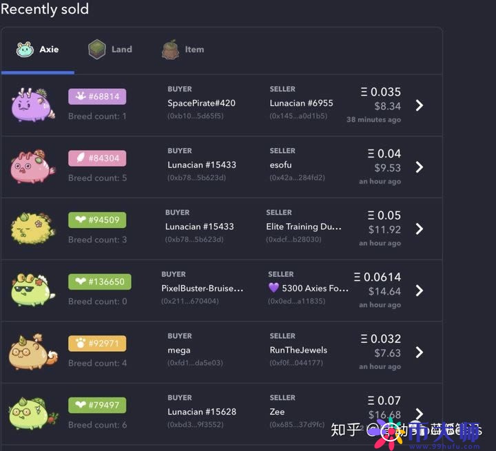 除了战斗,Axie 作为幻想生物,它还可以养成,可以生育后代。养育后代也可用来进行战斗,或者继续生育后代(最大数为 7)。为了生育后代,Axie 需要耗费一些 ETH 或 SLP 代币,SLP 代币是可互换的同质代币。除了在公开市场上购买,它还可以通过在游戏环境中参与游戏获得。这样产生了区块链游戏的新模式:通过玩游戏赚钱,因为赚得的 SLP 可以通过公开市场售出。这种模式同样增加了对 NFT(Axie)的需求。SLP 前几天通过 4chan 的 meme,导致它快速上涨,并引起人们关注。