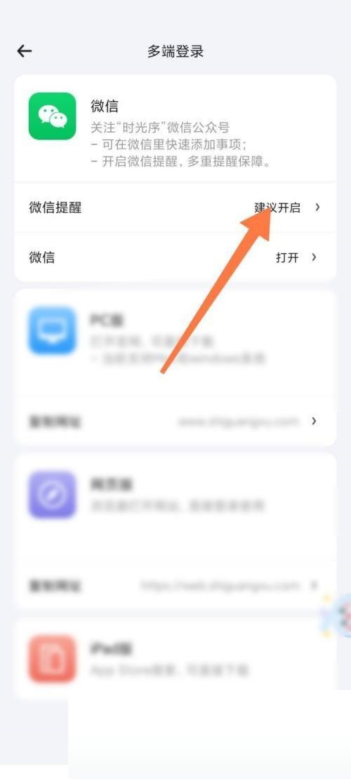 4、最后进入微信提醒页面,点击开启,即时光序开启微信提醒设置完成。