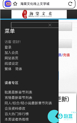 1、进入海棠小说网以后,我们点击顶部的菜单,就会从左侧弹出对应的菜单弹窗。