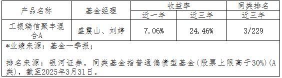 2、同类排名数据来源于银河证券,数据截至2025年3月31日。工银瑞信聚安混合(A类近一年、近三年分别居同类4/262、1/229,工银聚享混合(A类近一年居同类1/262,工银瑞信聚丰混合(A类近三年居同类3/229,同类基金指普通偏债型基金(股票上限高于30%(A类;工银瑞信可转债债券近三年、近五年分别居同类1/38、6/32,同类基金指可转换债券型基金(A类。工银瑞盈18个月定期开放债券近一年、近三年均居同类2/24、2/21同类基金指定开普通债券型基金(二级(A类;工银银和利混合近一年、近三年分别居同类20/329、25/289,同类基金指普通偏债型基金(股票上限不高于30%(A类。
