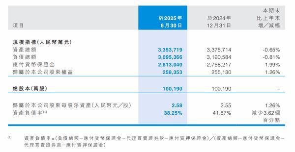 中泰期货表示,截至报告期末,本集团资产总额为人民币335.37亿元,较2024年末的人民币337.57亿元下降0.65%。本集团负债总额为人民币309.54亿元,较2024年末的人民币312.06亿元下降0.81%。归属于本公司股东权益为人民币25.84亿元,较2024年末的人民币25.51亿元增长1.26%。本集团资产负债率(其中资产总额与负债总额均扣除应付货币保证金、代理买卖证券款和应付质押保证金为38.25%,较2024年末的41.87%减少3.62个百分点。报告期内,本集团资产优良、财务状况良好。