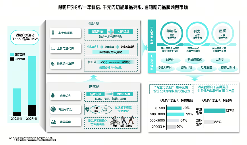 Z世代的新消费特征为品牌提供了新增长动力。《报告》显示,猛犸象、迪桑特、可隆、萨洛蒙、凯乐石、骆驼、伯希和等1300多个户外品牌在得物App通过新品、新玩法快速打开市场,并推动热度向长期销量转化,完成从爆款到经典的代表作沉淀。2025年至今,得物户外行业GMV同比去年增长了100%。