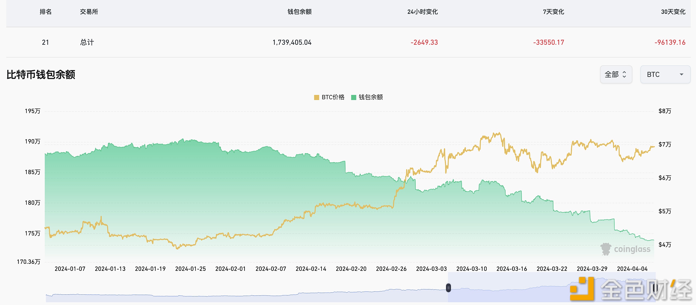近30天96139.16枚BTC流出交易所钱包,余额1,739,405.04枚BTC
