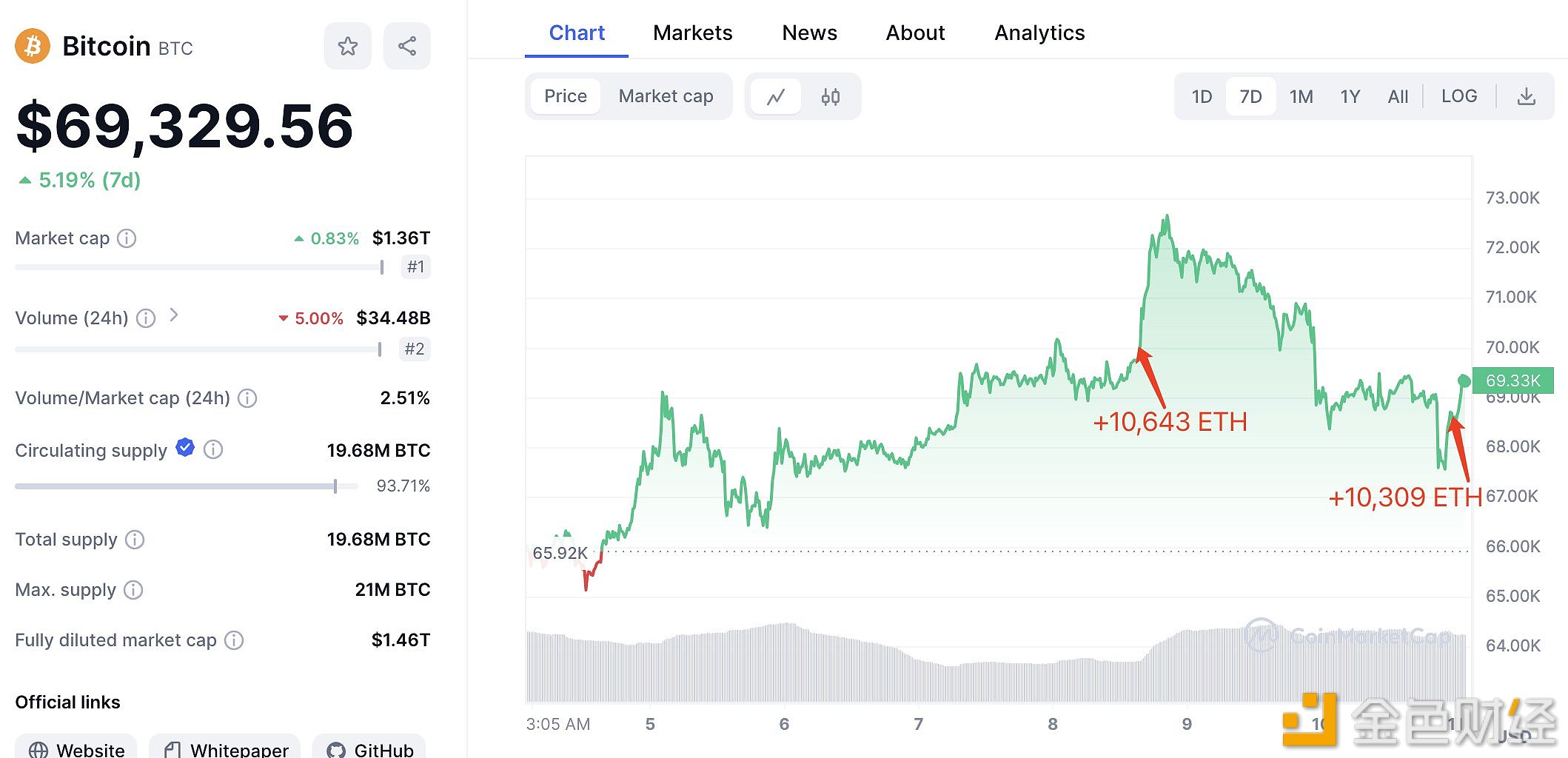 本站报道,据Lookonchain数据,大约2小时前,在市场下跌时,一位鲸鱼买入了10,309枚ETH(约合3582万美元)。并且在4月8日BTC上涨之前,他还买入了10,643枚ETH(约合3675万美元)。