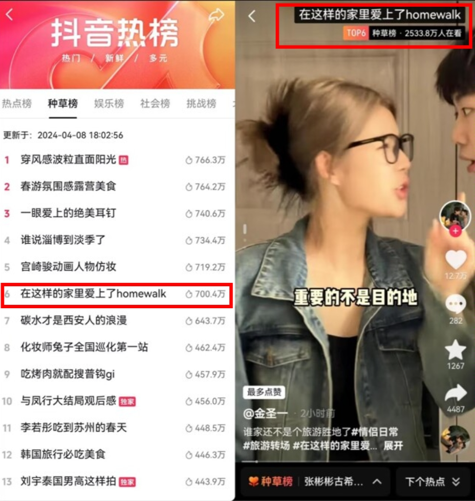 同时,「抖in心动家」结合春季家装节点和站内高热话题citywalk,以家为核心打造新词「homewalk」,联动与家场景强相关的热度达人输出趣味内容,放大活动影响力,商家也可借势热点话题,获得曝光提升。4月8日,热点话题词#在这样的家里爱上了homewalk 攀升至抖音种草榜TOP6,播放量高达3100w 。商家也能够通过将这些热点与自身的商品和短视频内容相结合,获取平台推荐流量,提升内容场和货架场的生意增量。