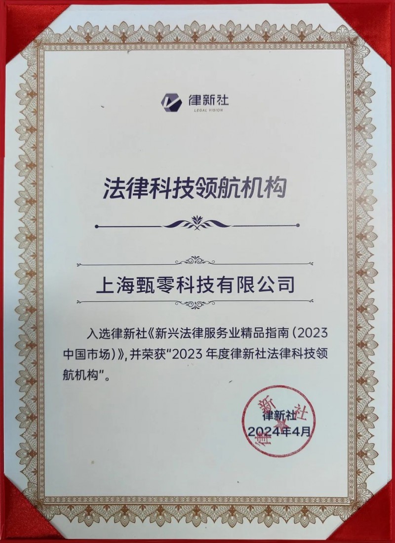 近期,第八届新兴法律服务业高峰论坛圆满举行,甄零科技入选律新社《新兴法律服务业精品指南(2023中国市场)》,并荣获2023年度律新社“法律科技领航机构”奖项。