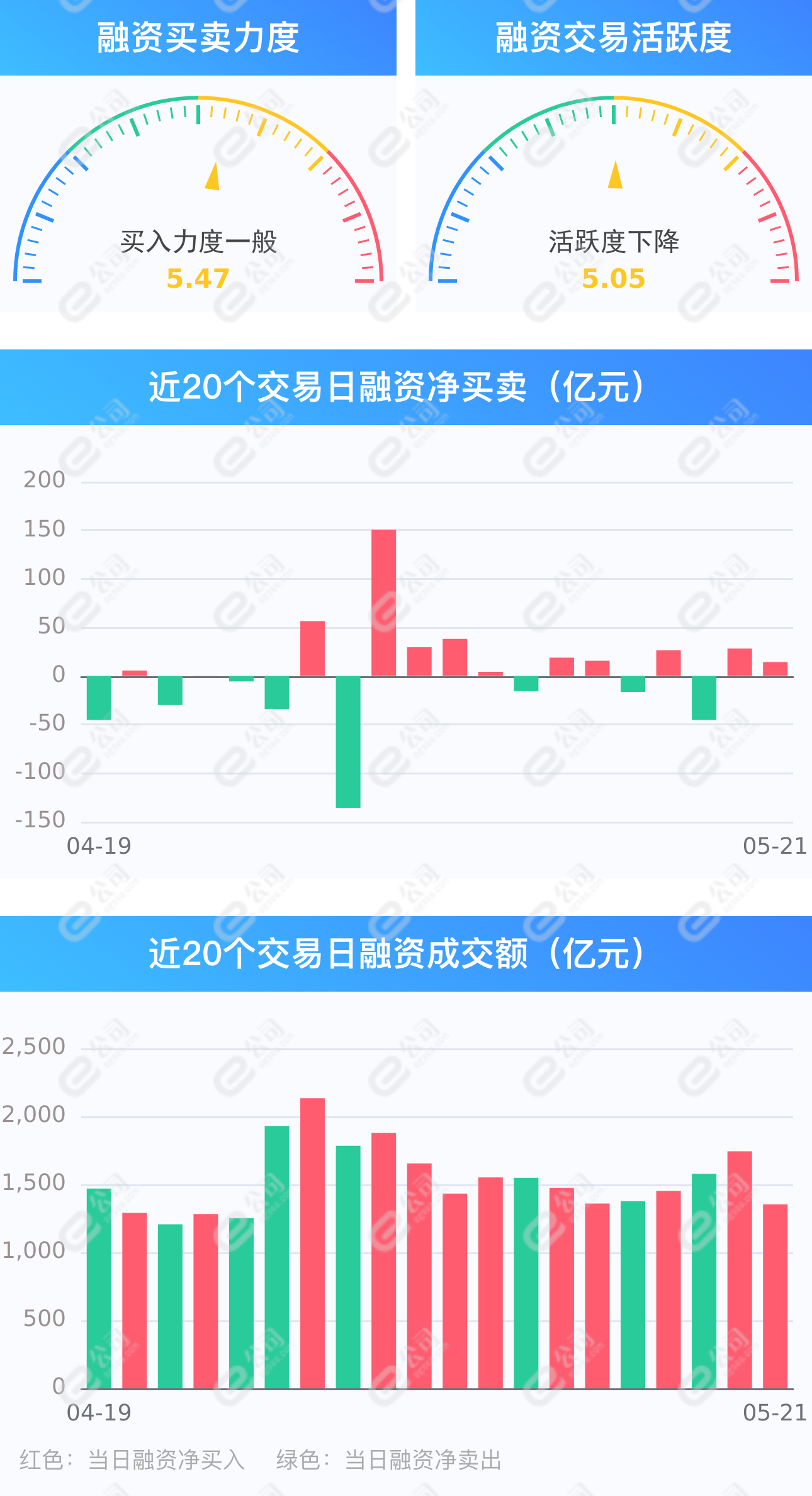 截至5月21日,上交所融资余额报7927.47亿元,较前一交易日增加9.01亿元;深交所融资余额报7049.38亿元,较前一交易日增加5.22亿元;两市合计14976.84亿元,较前一交易日增加14.23亿元。