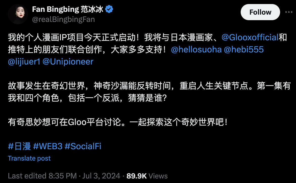 疑似范冰冰X账号官宣与Web3平台Gloo合作启动个人漫画IP项目