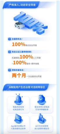 比如,嘀嗒出行目前在准入环节,全量新车主100%通过安全筛查,采取“机器辅助100%人工筛查 100%复核 重新抽查”的车主认证三重审核机制,针对现有存量车主每两个月一次全量滚动筛查。