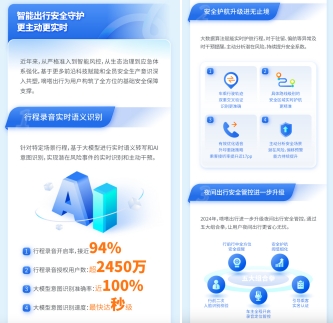 1、如今,端智能、AI算法和大模型等前沿技术已深入应用到顺风车安全的各个环节。比如行程录音语义识别干预、危险驾驶实时识别与阶梯管控等,极大提升安全干预的效率和精准度,且更主动更实时,让预防为主进一步落实。