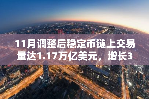 11月调整后稳定币链上交易量达1.17万亿美元,增长30.7% 更新时间:2024-12-03 00:23:21 •阅读 0 据 TheBlock 分析师 Lars 在 X 平台披露数据显示,11 月调整后稳定币链上交易量达 1.17 万亿美元,增长 30.7%;稳定币发行供应量增加 12%至 1672 亿美元新高,其中 USDT 和 USDC 的市场份额分别为 79.9%和 17.4%: