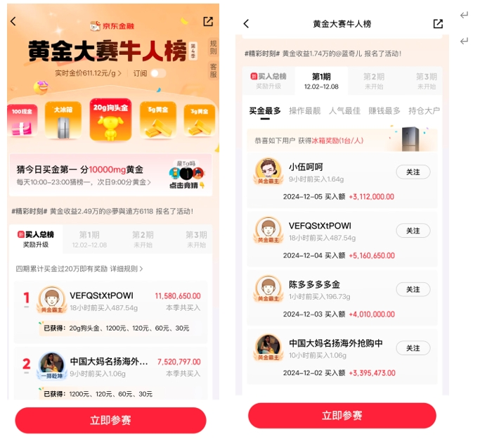 回顾前三季大赛,每一季都吸引了海量投资者参与,通过激烈的竞争与交流,有效促进了投资者对黄金市场的深入理解与认知提升。而此次第四季大赛,在赛制设计、奖励等多方面均实现优化升级。分买金最多、操作最靓、人气最佳、赚钱最多、持仓大户的榜单,交易日买金过万就能拿奖,每天交易金额最多的用户获得大冰箱一台;活动期间累计买金超过20万即可获得奖励,累计买金超过一千万可以得20g狗头金,奖励多多。
