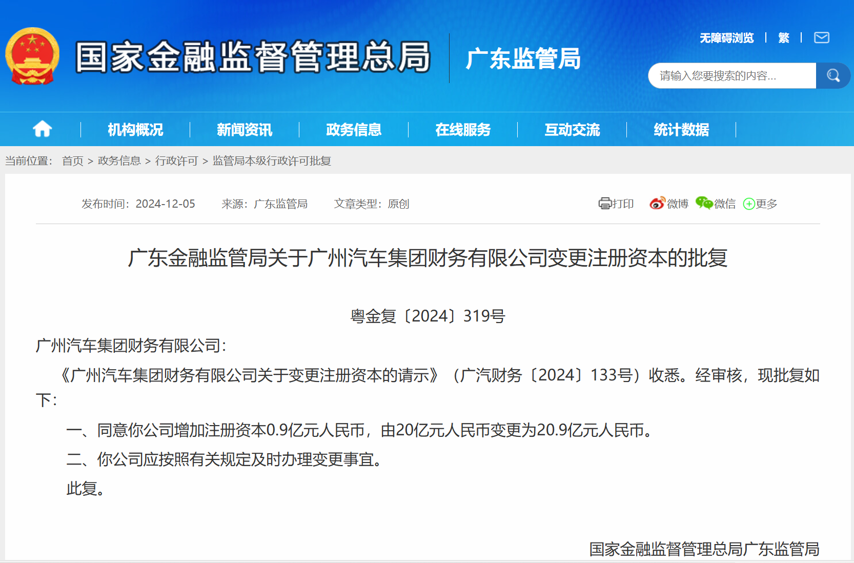 财经12月9日讯 日前,广东金融监管局发布相关批复,同意广州汽车集团财务有限公司(简称:广汽集团财务公司增加注册资本0.9亿元人民币,由20亿元人民币变更为20.9亿元人民币。以下是相关批复正文: