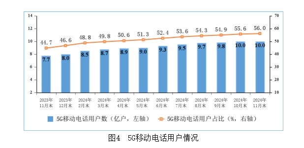 工信部23日公布2024年前11个月通信业经济运行情况。数据显示,我国5G用户数突破10亿户。截至11月末,三家基础电信企业及中国广电的移动电话用户总数达17.9亿户,比上年末净增4682万户。其中,5G移动电话用户达10.02亿户,比上年末净增1.8亿户,占移动电话用户的56%,占比较上年末提高9.4个百分点。(中新财经