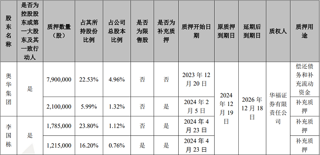 2023年12月20日,奥华集团向华福证券有限责任公司质押790万股,用于偿还债务和补充流动资金。2024年上半年奥华集团与李国栋补充质押合计510万股。