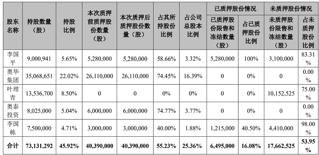 公告披露,奥华集团持有广生堂股份3507万股,持股比例为22.02%,质押比例达到74.45%。李国栋持有广生堂股份750万股,持股比例为4.71%,其将所持有的四成股份用于质押。