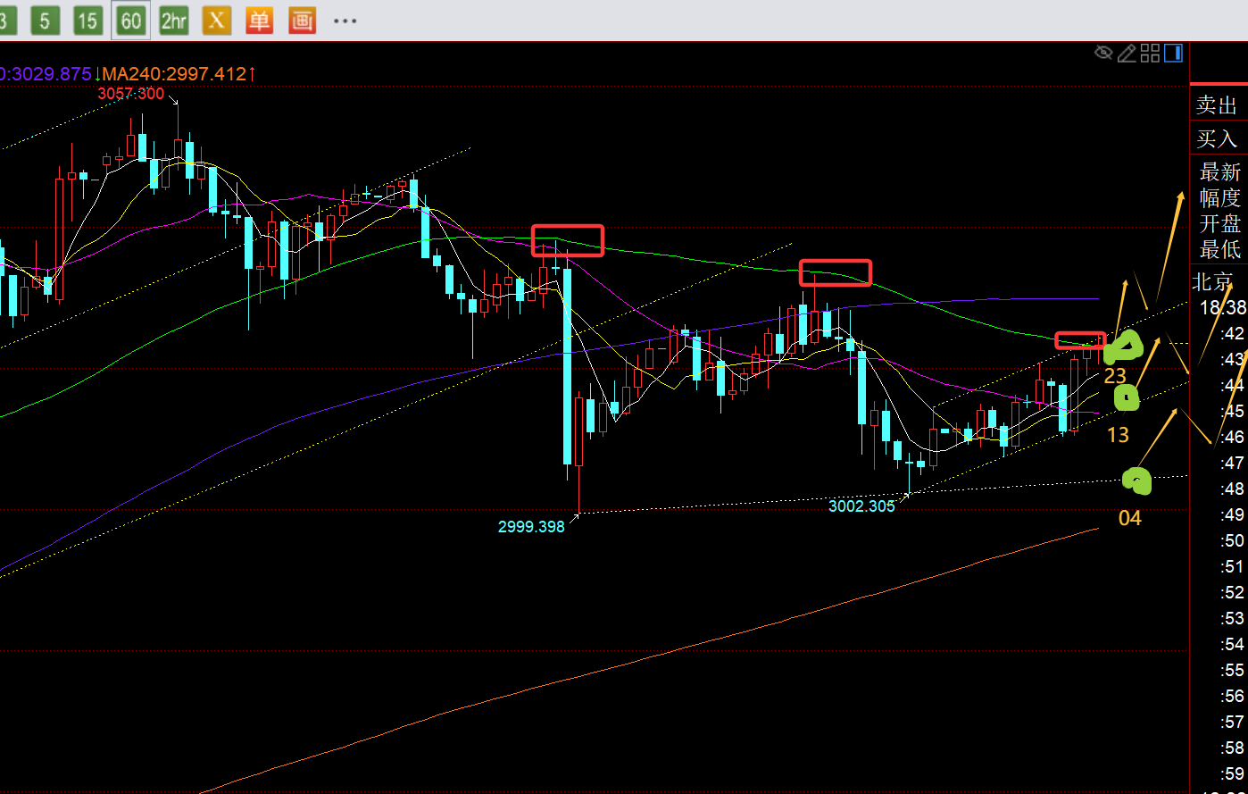 第三,黄金小时线级别:今日亚欧盘又是震荡式慢上涨形式,和昨日雷同,那么就看今晚能否延续反弹拉升,还是仍会震荡不延续,向下打压破低再反抽;此周期的关键阻力是66日,前两日触及未能突破站上,当前再度测试,即3023,也刚好是图中黄色上行通道的上轨承压点附近;若能连阳突破站上3023,那么今晚就基本会延续一波拉高,如此4小时中轨或日线5均线都有上破的大概率;反之,若3023-25上轨一直无法突破站上,就还需等下轨3013-14之上,或白色趋势支撑点3004-05之上企稳去看涨;这几日3000之上陆续低位抄底看涨的可以继续上看,等待柳暗花明的一刻;