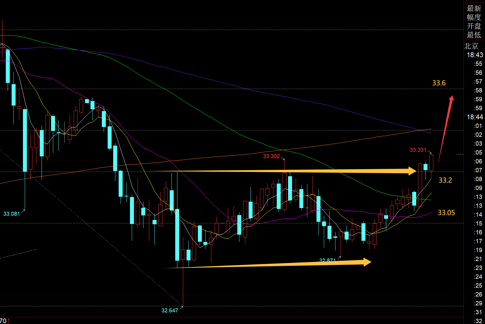 白银方面:它的慢涨形态比黄金更好,也需要看今晚能否延续;支撑33.2、33.05,阻力33.6,按正常技术走法,美盘前后回测可二次看涨至33.6;但也要谨防类似昨日那种不延续折腾走法出现;