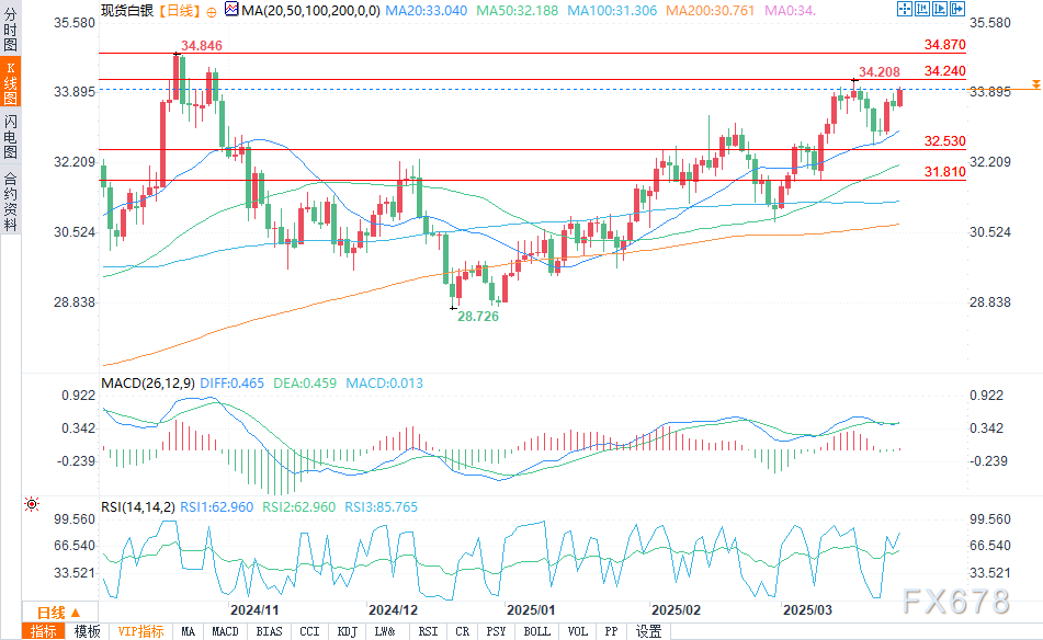 周四(3月27日)欧盘时段,白银盘中涨幅超过1%,价格突破34美元。随着宏观面和技术面支撑增强,多头将目标瞄准34.87美元。