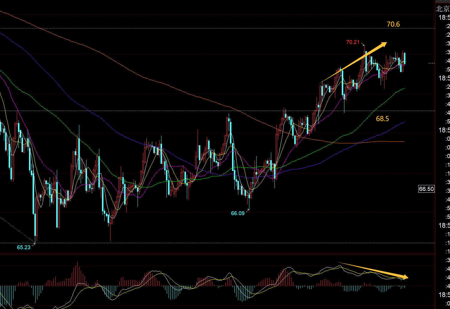原油方面:震荡式墨迹的拉升,从上图看,macd顶背离在积累了,压力70.6,支撑68.5,先关注此区间内运行,要谨防拉高跳水修正;