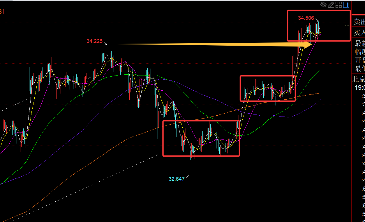 第二,白银方面:前日33.6二次看涨,昨日欧盘强势突破新高,晚间回踩33.8二次看涨,全部抵达34.2-34.3目标;