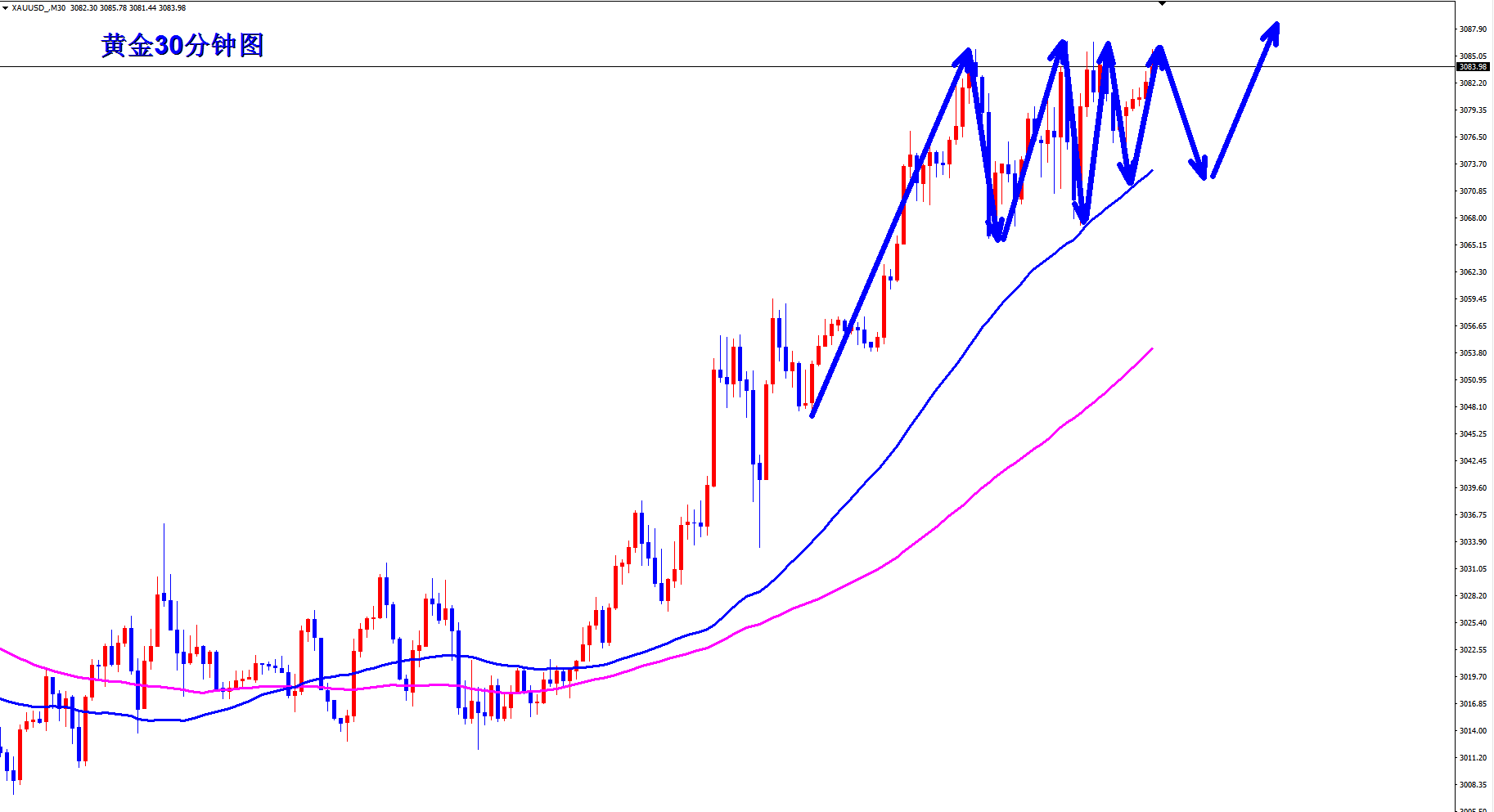 黄金周五美盘虚破冲高回落,黄金3085直接空,文章也直接公开提示3085直接空,黄金如期下跌收割,不过黄金暂时还是只是调整,黄金后半夜再次起涨,黄金多头还是比较强劲,下周回落还是继续多,毕竟现在黄金多头强势,不过高位就不要追多了,等回落再多。