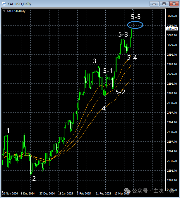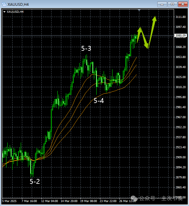 黄金刷新历史高点已经成为日常,在前文的月线图和周线图走势梳理中,都在强调客观极端强势,不预测终点。但日线图所体现出的风险信息也不得不重视:日线图所展现出的是2024年11月14日以来的双重5浪上涨结构,如上图。从图中的划分可以看出,3浪和5-3都是延长浪,这很清晰;照常规推算,5-5的强阻力就在3100-3115范围。如果是这样的节奏,那么受阻后回落的最终幅度会在2830-2956范围,这算是一个非常大的回落风险。尊重客观涨势的同时,得看到这个高风险的存在。黄金4小时图(周内)