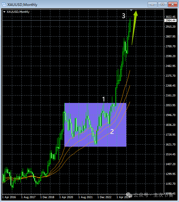 黄金在图中阴影区域盘整了3年多时间,积累了相当多的动能,按照常规比例来说,向上突破后爆发450美元左右是很正常的(区间垂直高度)。所以预期涨向2545只是第一步目标或者说最小目标。黄金已经完全向上脱离原横盘区间,进入长线上涨阶段。