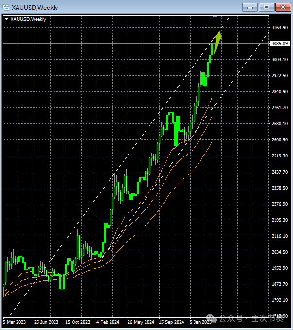 2990也已到达,最高见3004.82,这表明图中的3浪上涨依然在延续,没有任何进入4浪调整的迹象。此前的几次回调过程,都偏早地在认为4浪正出现,最后却只是更小级别的子浪回调。现在每往上一步都是历史新高,且黄金分割、通道阻力等均已经被突破,暂时没有可靠依据预测下一个目标,所以要做的就是跟随,没结束,还早。同时,我们注意到2025年6-7月是重要的时间窗口,届时再判断是否有重大变化。黄金周线图(长线)