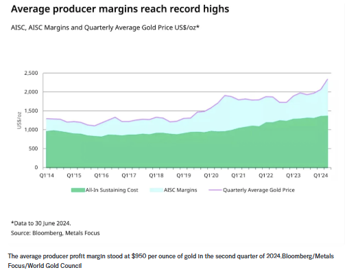 根据世界黄金协会数据,黄金开采利润近年来显著增长。2024年第二季度,黄金矿企平均利润率高达每盎司950美元,为2012年以来最盈利的时期。