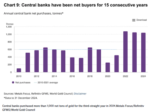 2024年,全球央行净购入黄金1045吨,连续第三年超过千吨规模。