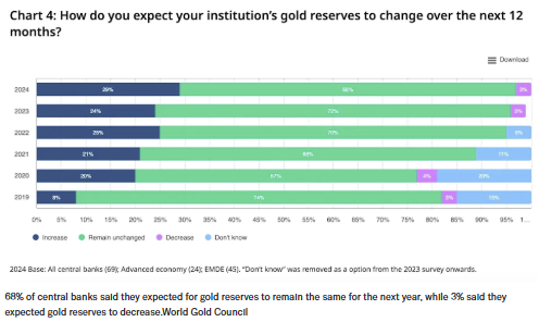 但米尔斯指出,黄金的全球需求正现疲态。世界黄金协会去年的一项调查显示,71%的央行表示未来12个月将维持或减少黄金储备。