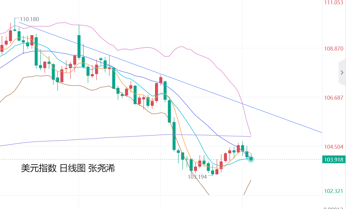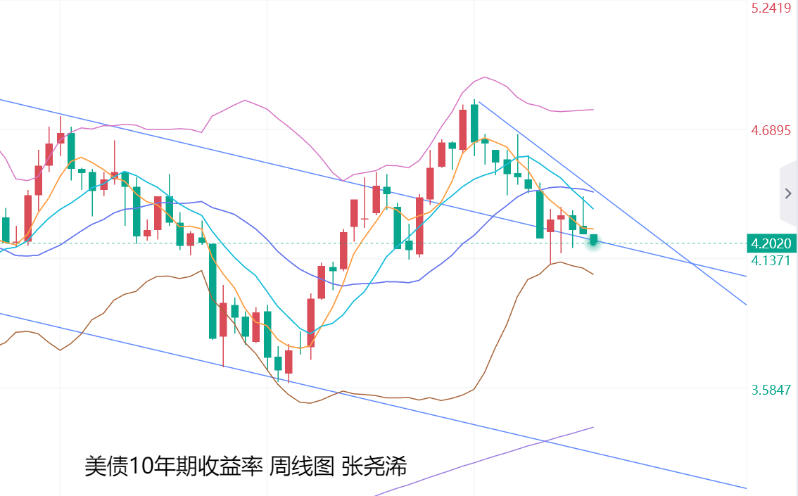美债10年期收益率,日图,上周五大幅回撤收跌,再度触及200日均线支撑位置,维持着近期的震荡盘整行情,虽仍未跌,但也未反弹突破1月份高点而下的趋势线压力,周图也在遇阻10周均线及中轨线附近后表现回撤,布林带依然偏向下延伸,附图指标维持空头信号发展,暗示后市走势仍偏空为主,而会支持金价。