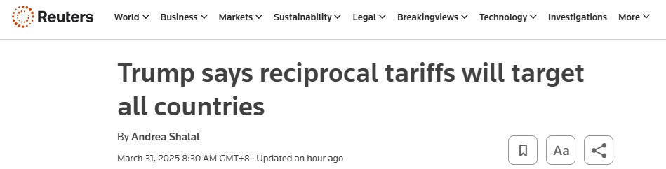 特朗普表示,他的“对等关税”打算从“所有国家”开始,这打击了人们对他可能会限制4月2日公布的初步关税范围的猜测。