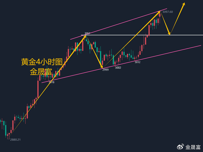 黄金1小时还是金叉向上的多头发散排列,黄金多头力度还在,只不过黄金早盘冲高,那么我们就要谨防黄金短线调整,黄金突破上次历史高点3057,那么黄金3057短线来是一个转折性的支撑,回落3057上继续逢低做多。只要不跌破3057,那么黄金就还是继续属于多头的主场,短期处于强势单边当中。亚盘回踩后预计还会进一步的延续慢涨冲新高,以中轨做为防守,中轨之上依旧先行看多。不管是日线还是4小时线指标偏强,整体走势偏多发展。综合来看,黄金在连续的上涨走势之中,多头节节攀升,低点不断上移,高点不断刷新,目前来看金价仍然有上涨的空间,下方重点关注3070一线支撑,其次就是3057一线了,至于压力位当前上方没有太大参考性,关注3100整数关口压力位即可。综合来看,今日黄金短线操作思路上金晟富建议回调做多为主,反弹做空为辅,上方短期重点关注31-3105一线阻力,下方短期重点关注3066-3070一线支撑,各位朋友一定要跟上节奏。要控制好仓位及止损问题、严格设止损,切勿抗单操作。具体点位以盘中实时为主,欢迎前来体验,交流实时行情,进群关注实时单。
