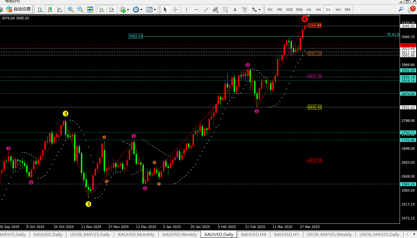 综合而言:目前价格将继续冲高而短期3084-87就是当前的做多点位。防守点位位于3076-73一线。上方压制点位于3107-3109附近。因为本周是非农周,所以基本周一到周三是震荡冲高的关键,周四到周五是抉择的时候。