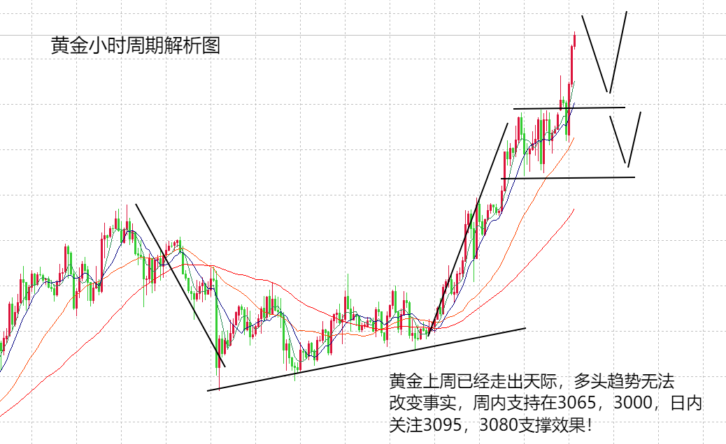 现在的行情必须要恭喜做多看涨的朋友,因为黄金已经走出了大涨,顺势送利润,也要劝告市场搏空猜顶的朋友,顺势交易才是王道,逆势获利全靠运气。这个周期黄金的上涨影响因素很多,地缘局势紧张,川普关税不确定刺激,美联储未来还有加息的可能,美指下跌的表现,都是刺激黄金避险需求,从上周黄金3000到现在3110,已经单边走出110美金的上周空间,并且各方面也没有见顶的表现,所以,必须要强调本周上周不猜顶,现在只要跟随行情,而不是预测行情。另外,交易的主思路保持前期的原则不变,看涨趋势中不追高,等待回落做有效多单。从技术面来看,现在周线表现,日线表现,H4周期表现都是极强状态,丝毫没有回落的形态和下跌欲望,所以,周期性看涨需要等待日线见顶或者走出连跌后再看有效回落的空间。既然趋势明显,那么,周内交易就找每日回落支撑点做多即可。本周的趋势支撑点在3000附近,强弱关键点在3065,只要不破3065就是绝对强势,只要不破3000就难以出现多空转换,那么,日内关注这两个点的得失,再决定多空或者强势变化。对于日内行情而言,小周期下方关键支撑点在3095和3080,早盘冲高不追多,欧美盘回落到这两个关键点再看是否可以做有效多单,上周则跟随市场变化再给判断。另外,需要强调的是,本周影响市场因素较多,周三有关税落地,小非农ADP数据影响,周五有非农数据影响,市场变化较大,风险较大,大家注意避开风险,做有效交易。