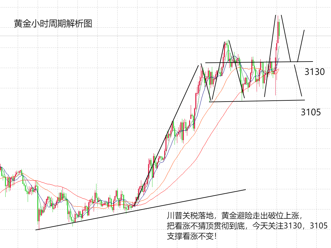 川普关说落地后,市场反应激烈,美指走出暴跌空间,这走势不仅没有提振黄金,反倒是黄金跟美元出现同步下跌,而且出现在极强下的单边,单日最大跌幅,从3168到3055,走出接近120美金空间。山海在黄金跌至3055后分析过,虽然这波黄金下跌空间很大,但并没有改变当前的多头趋势,而调整后还有上涨的可能,实际上,黄金出现暴跌后午夜形成反弹,再次收高至3135高点,再次体现了今年黄金绝对多头。目前黄金收盘在3110附近,很显然,经过周四的暴涨暴跌,周五黄金就老实了,大概率是要修整一下,走震荡区间,但今天有非农数据,所以,今天的走势也并不简单,大家要注意风险空间。从技术面来看,黄金日线周四大阴收跌,直接破位单边5,10日均线支撑,但没有破位布林中轨支撑,所以,日线周期依旧是强势,只不过这根大阴过于强大,形成阴包阳状态,所以,现在黄金不是之前的极强,那么,黄金在这种状态下涨跌都有可能。上方关注前期高点3150,下跌则关注3055得失。H4周期很巧妙的进入了震荡区间,虽然市场走出大跌空间,但H4周期布林没有开口,均线系统没有发散,暂时有效的区间在3095/3150之内,所以,如果周五不出现较大波动的话,可参考H4周期的区间来做高空低多交易。不过小周期调整过大,下方的空间也并不是一定那么小,下方还有一个支撑在3080,上方也有一个相对高点在3135,所以,今天行情还是看涨趋势,交易以低多为主,总结起来就是上方关注3035,3150,下方关注3095,3080,可以参考这几个关键点做顺势多单。当然,今晚还有非农数据影响,预计经过周四的大涨大跌,周五数据影响不会很大。