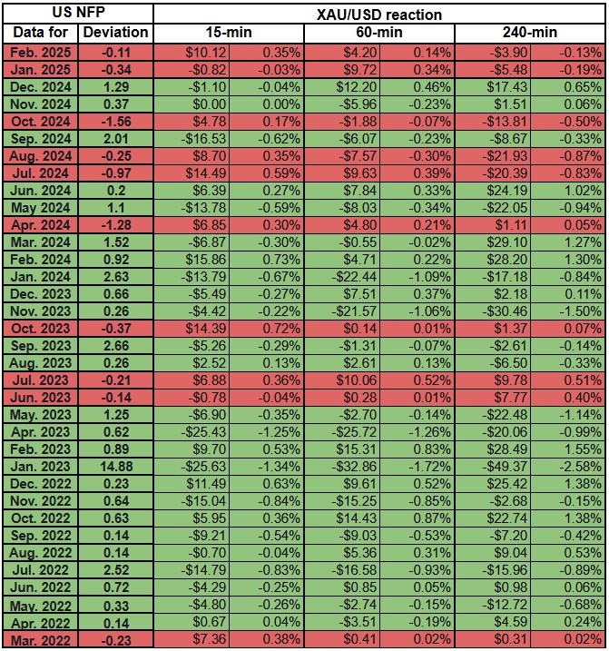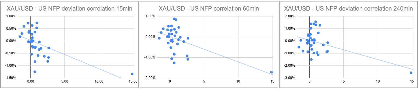 我们绘制了非农数据发布后的15分钟、1小时和4小时内的黄金价格反应。然后,我们将黄金价格的反应与实际非农结果与预期结果之间的偏差进行比较。