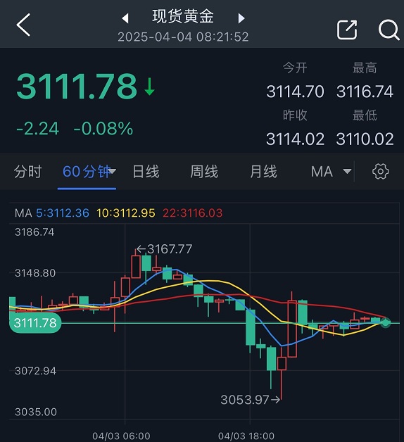 现货黄金周四收盘下跌16.84美元,跌幅0.54%,报3114.02美元/盎司。