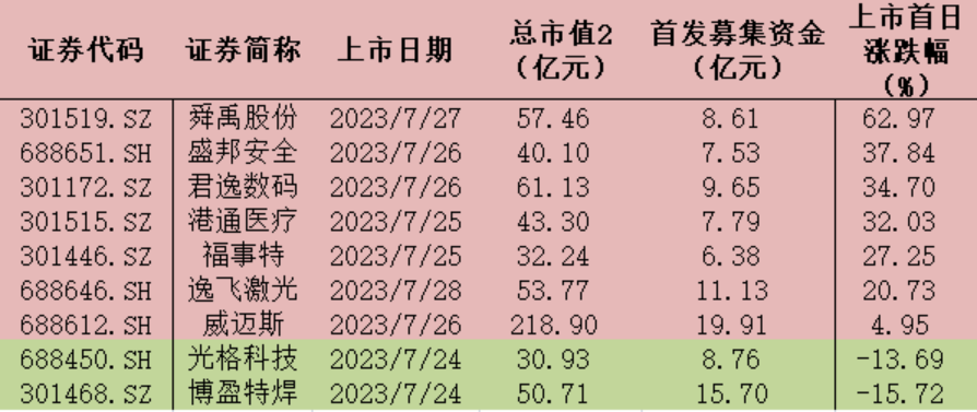 7月24日-28日(当周,下同),新股市场波澜不惊,共计9只新股登陆A股市场,合计募集资金95.5亿元,首日平均涨幅为21.22%。