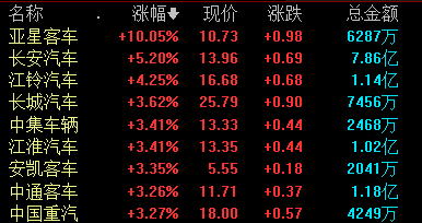 7月25日,汽车整车板块拉升,截至发稿,亚星客车涨停,长安汽车涨超5%,江铃汽车、长城汽车、江淮汽车、安凯客车等跟涨。