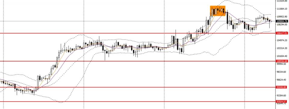 比特币小幅反弹,立于10日均线之上,日线RSI仍位于高位,4小时反复试探106000附近支撑,如维稳于上方,短线预计将继续站上110000。