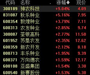 8月7日,种植业板块涨幅居前,截至发稿,神农科技涨超9%,秋乐种业涨超5%,敦煌种业、农发种业、荃银高科等纷纷跟涨。
