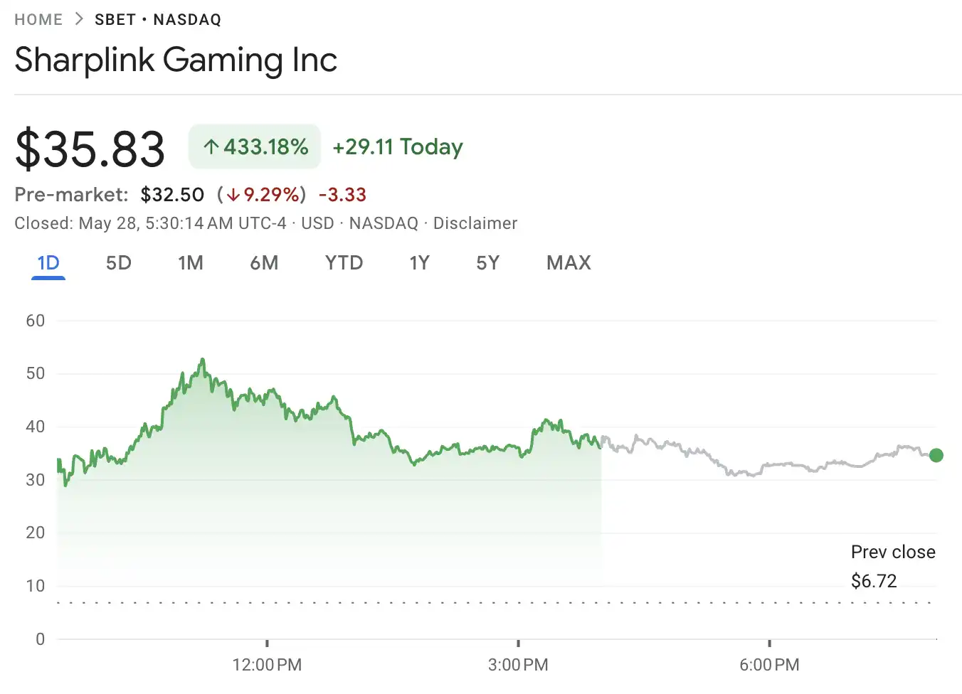 SharpLink 的这一战略迅速点燃了资本市场热情。公告发布当天,股价从前一交易日的 6.72 美元飙升至盘中高点 53.45 美元,最终收于 44.74 美元,涨幅超 650%。截至 5 月 28 日下午 1:30,股价稳定在 35 美元左右,市值达到 25 亿美元。换句话说,SharpLink 通过 4.25 亿美元的融资,创造了约 25 亿美元的账面估值,堪称「加密金库公司」模式的教科书式案例。