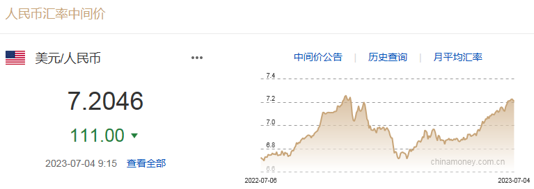 中国外汇交易中心数据显示,7月4日,人民币兑美元中间价报7.2046,调升111个基点。
