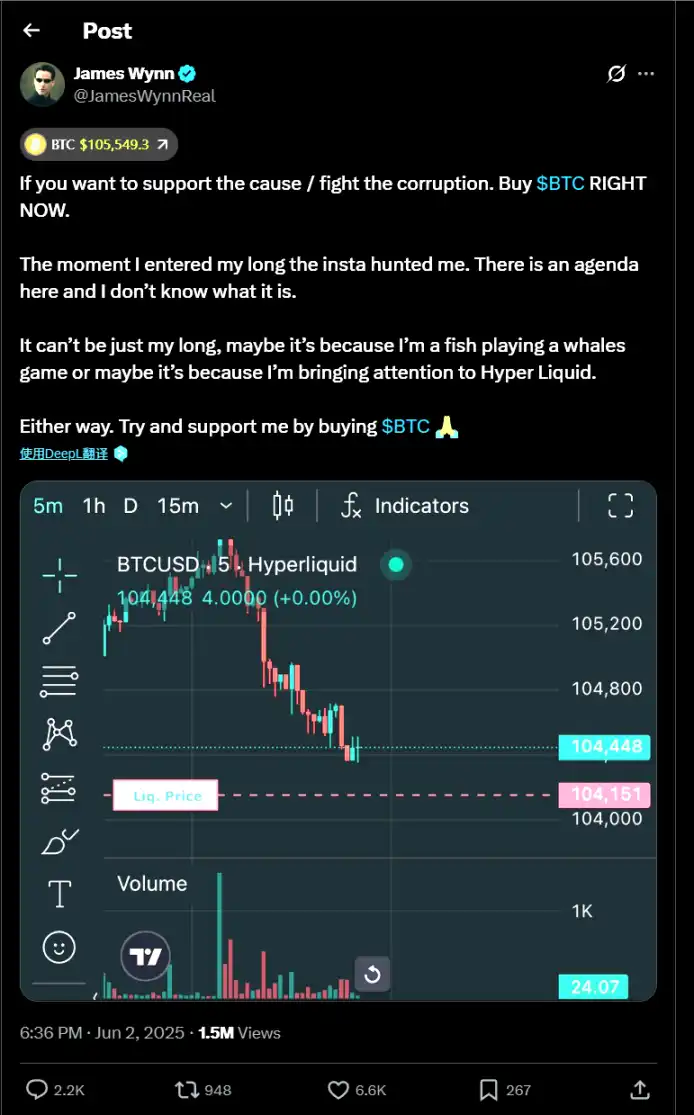 对此,James Wynn 显得有些「上头」,他振臂高呼,「如果你想支持这个事业 / 对抗腐败,现在就买 BTC。我刚一做多,就被瞬间狙击。这里肯定有某种阴谋,我不知道是什么。不可能只是因为我的多单,可能是因为我只是个小鱼在玩大鲸鱼的游戏,或者是因为我引起了大家对 HyperLiquid 的关注。不管怎样,试着通过买 BTC 来支持吧!」