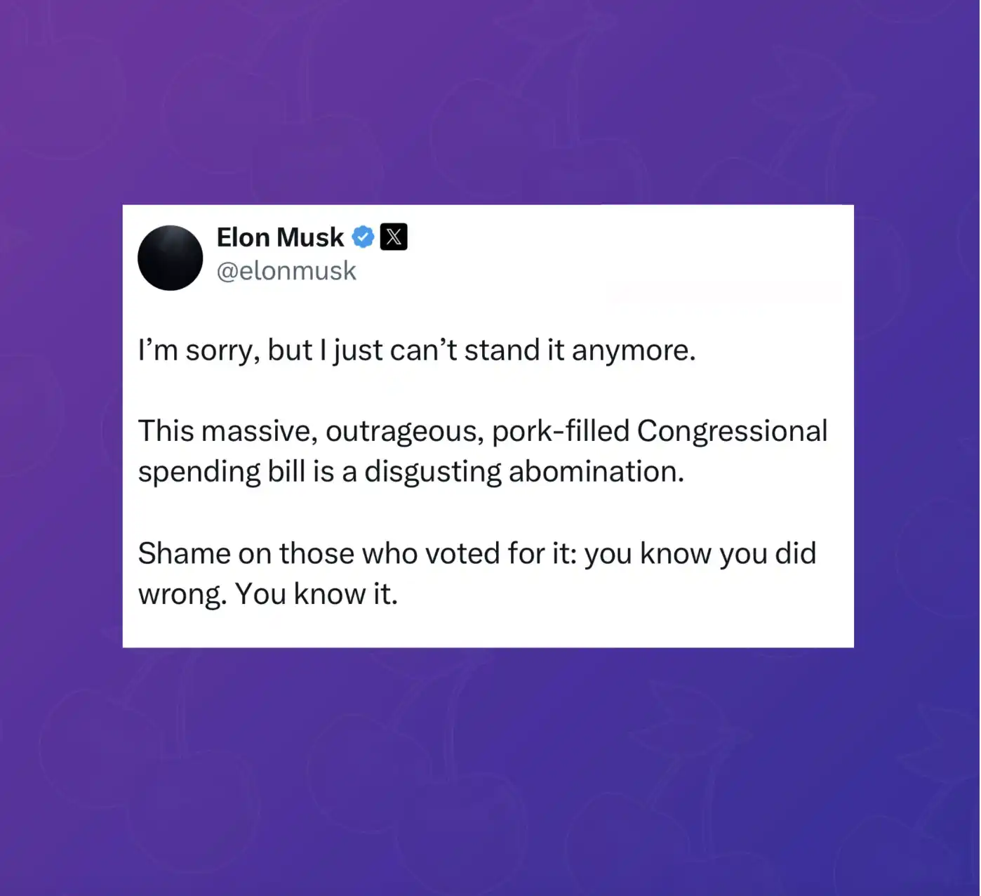 「对不起,我真的忍无可忍了。」马斯克直言不讳地写道,「这份充满私货、荒唐可笑的国会支出法案,是一场恶心的灾难。投票支持它的人应该感到羞耻,你们自己也知道你们错了。」