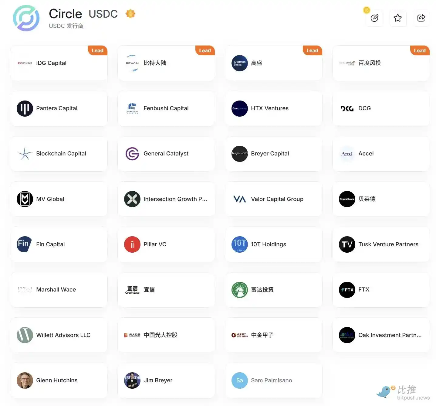 早在 2016 年,百度、光大控股、中金甲子、宜信等中资巨头便以战略投资者身份押注 Circle,成为其最早一批支持者之一。如今主流化提速,早期股东也被重新聚焦。其中,光大控股近一周涨幅已高达 38.8%,市场已在率先反应这一潜在红利。以下是 Circle 的投资方: