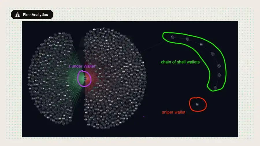 c. 观察到「中心-辐射」结构:一个钱包为多个狙击钱包注资,所有狙击同一代币。